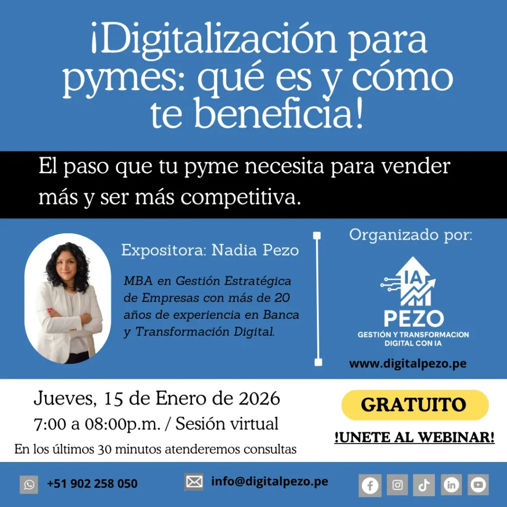 Hola, PEZO GESTIÓN Y TRANSFORMACIÓN DIGITAL CON IA, los invita a un webinar GRATUITO para iniciar el 2026 enfocados en digitalizar para hacer crecer las ventas de tu PYME.